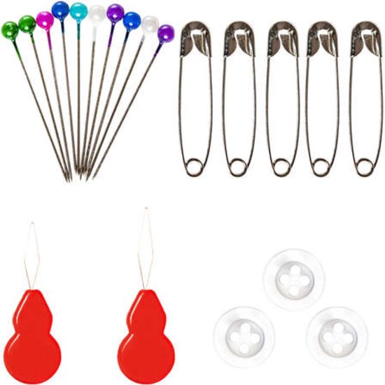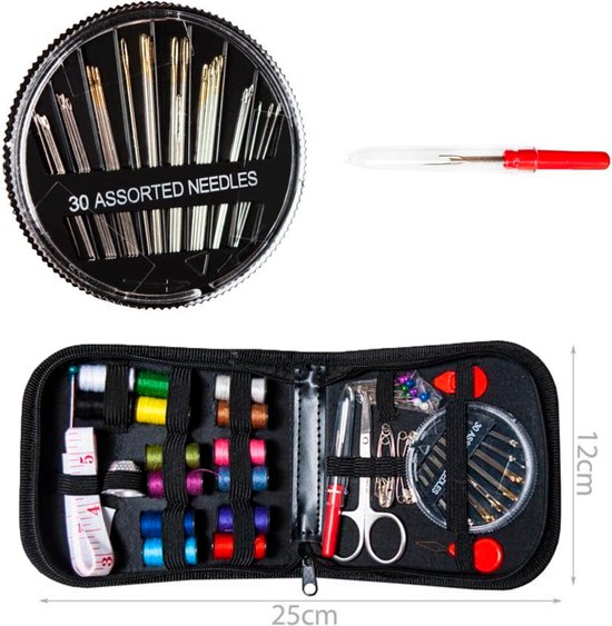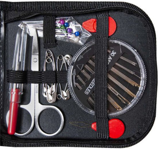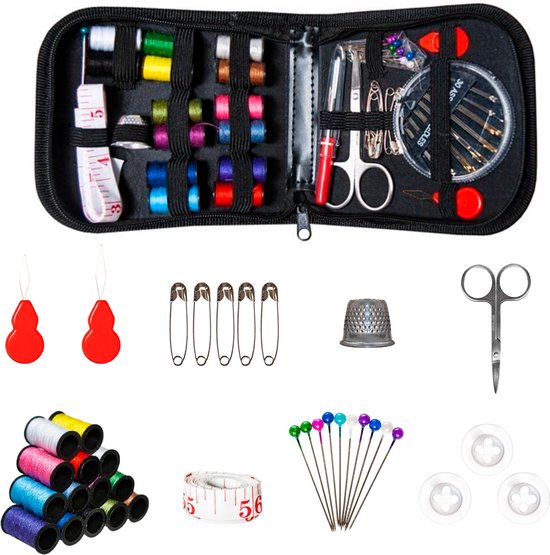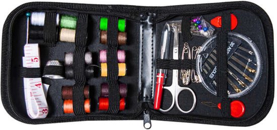 De set bevat 14 spoelen met gekleurd naaigaren, diverse handnaalden, een metalen vingerhoed, tornmesje, veiligheidsspelden, naaldinrijger, knopen, een meetlint én een schaar. Kortom: alles wat je nodig hebt om kleding te repareren, knopen vast te zetten, mondkapjes te maken of kleine naaiprojecten uit te voeren.