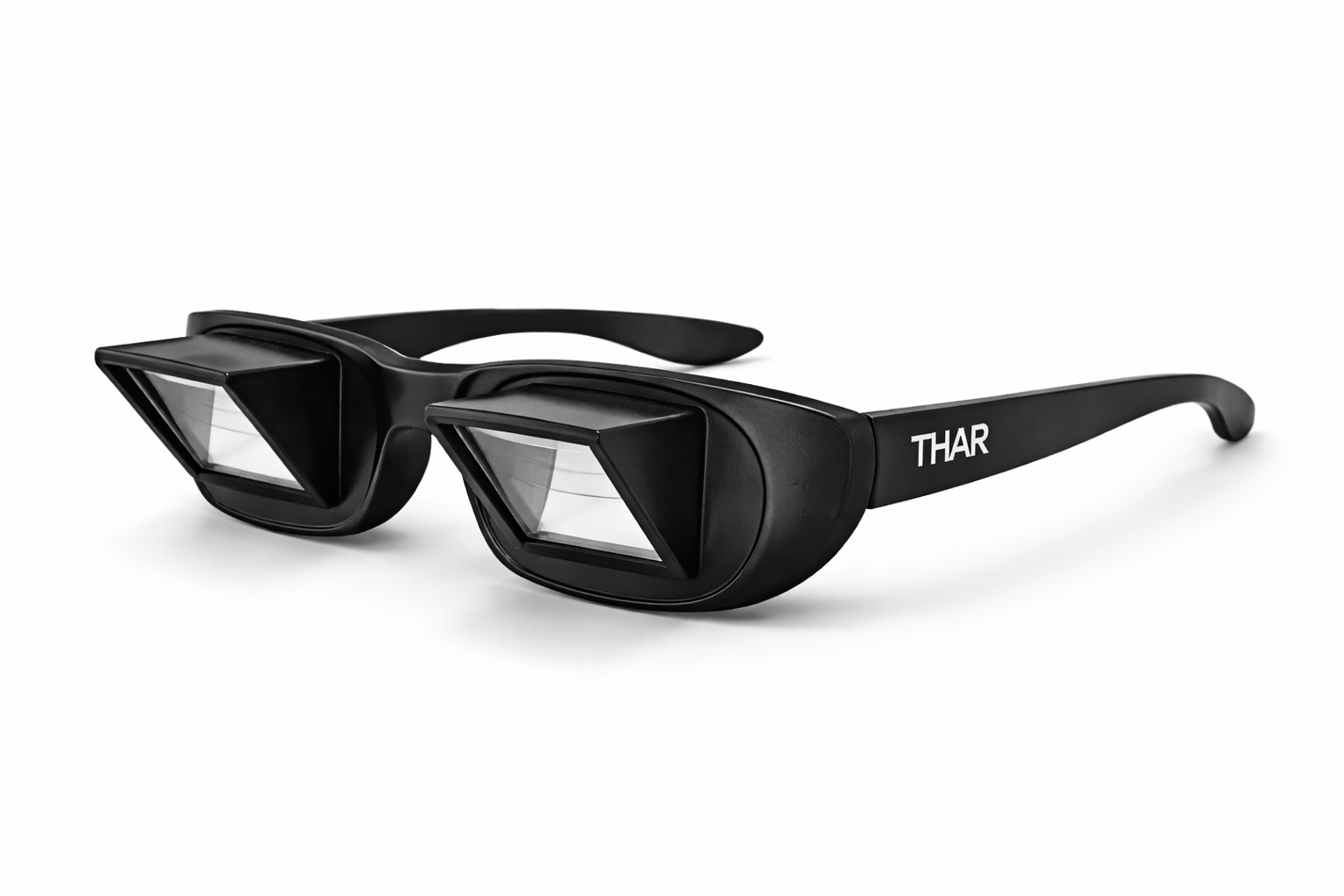 De THAR 90 graden prisma bril Medium is ontworpen voor volwassenen die comfortabel willen lezen, tv willen kijken of een smartphone of tablet willen gebruiken in liggende houding. Dankzij het 90 graden prismasysteem buigt de bril het beeld horizontaal om, waardoor je recht vooruit kijkt terwijl het beeld naar beneden wordt geleid en een ontspannen kijkhouding ontstaat.