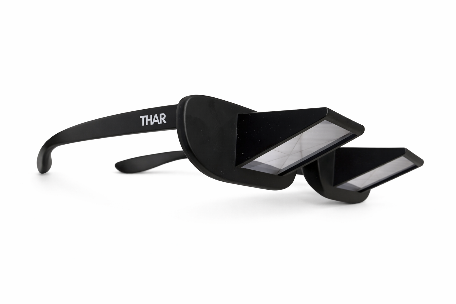 De THAR 90 graden prisma bril Small is ontwikkeld voor gebruikers met een smaller gezicht of voor jeugd die comfortabel wil lezen, tv wil kijken of een smartphone of tablet wil gebruiken in liggende houding. Dankzij het 90 graden prismasysteem buigt de bril het beeld horizontaal om. Daardoor kijk je recht vooruit, terwijl het beeld naar beneden wordt geleid en een ontspannen kijkhouding ontstaat.